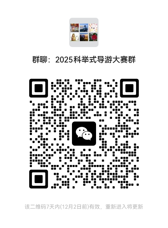 报名表: ② 导游组:参赛选手自选景点进行5-6分钟讲解,由评委根据讲解内容、语言表达、形象气质等方面打分,按照笔试成绩及讲解评分权重综合计算初赛总分,选拔出分值排名前20位选手进入决赛。 ③ 排工组:参赛排工自选景点进行5-6分钟讲解,由评委根据讲解内容、语言表达、形象气质等方面打分,选拔出分值排名前6位选手进入决赛。 ④ 新媒体组:选手在报名时须唯一指定一个本人运营的抖音直播账号作为参赛账号。 ⑤ 外语组:除报名表以外,要提供5分钟左右本人出镜的外语讲解视频。 02竞赛内容 比赛活动分为初赛和决赛两个阶段进行。 初赛时间:12月2日 决赛时间:12月24日 本篇仅讲解初赛要求。 模块一:笔试(仅导游组(讲解员)需要参加) 参加理论考核,命题题库主要围绕《三明市“十四五”文化和旅游发展规划》《三明市旅游服务质量提升行动方案》等旅游行业的相关政策法规、热点问题及泰宁旅游发展情况和旅游相关业务技能。 11.10.理论知识 300 道—2025 年泰宁“科举式”导游大赛题库.docx 模块二:面试 1.导游(讲解员)组/排工组: 参赛选手自选景点进行5-6分钟讲解,由评委根据讲解内容、语言表达、形象气质等方面打分,按照笔试成绩及讲解评分权重综合计算初赛总分,选拔出分值排名前20位选手进入决赛。 2.新媒体组/外语组: 无须参加初赛笔试和面试,新媒体组在组委会通知的指定时间内提供报名账号直播的相关数据截图,外语组提供要求视频即可。 模块三:初赛免赛条件 截止2025年10月已取得中、高级导游,省级金牌导游、金牌讲解员、国家金牌项目人,市级竞赛一等奖以上及三八红旗手、市级及以上五一劳动奖章,三明市革命老区基地讲解员5星级讲解员等荣誉的可免参赛,直接参加泰宁县导游等级评定申报;获得省市级同类型赛事优秀奖以上人员可直接进入决赛。 03获奖评选 1.导游(讲解员)专场 一等奖1名(奖金1000元)颁发荣誉证书 二等奖3名(奖金800元)颁发荣誉证书 三等奖6名(奖金500元)颁发荣誉证书 2.排工专场 一等奖1名(奖金1000元)颁发荣誉证书 二等奖1名(奖金800元)颁发荣誉证书 三等奖1名(奖金500元)颁发荣誉证书 3.新媒体人气奖 一等奖1名(奖金1000元)颁发荣誉证书 二等奖1名(奖金800元)颁发荣誉证书 三等奖1名(奖金500元)颁发荣誉证书 4.外语推介奖 一等奖1名(奖金1000元)颁发荣誉证书 二等奖1名(奖金800元)颁发荣誉证书 三等奖1名(奖金500元)颁发荣誉证书 获得一等奖的 导游(讲解员)或排工, 符合条件的由县总工会授予 “泰宁县五一劳动标兵”称号。 04参赛方式 优先扫码进群报名,如若二维码过期,可联系报名负责人:李姐(微信号:lzp20045116)