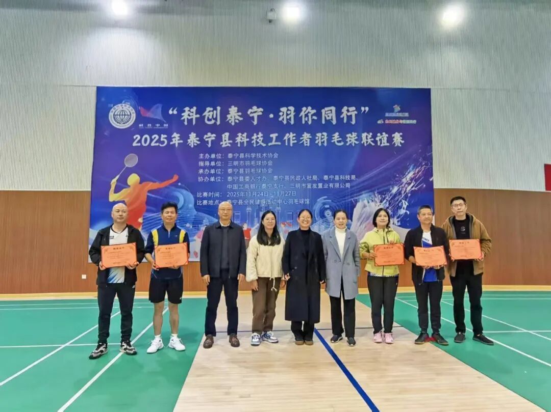 11月27日晚,为期四天的“科创泰宁·羽你同行”2025年泰宁县科技工作者羽毛球联谊赛在泰宁县全民健身活动中心羽毛球馆圆满闭幕。赛事由泰宁县科学技术协会主办,县委人才办、县民政人社局、县科技局、工商银行泰宁支行、宜发置业有限公司共同协办,县羽毛球协会承办,旨在丰富科技工作者的业余文化生活,增进跨领域科技人才之间的交流与团结。