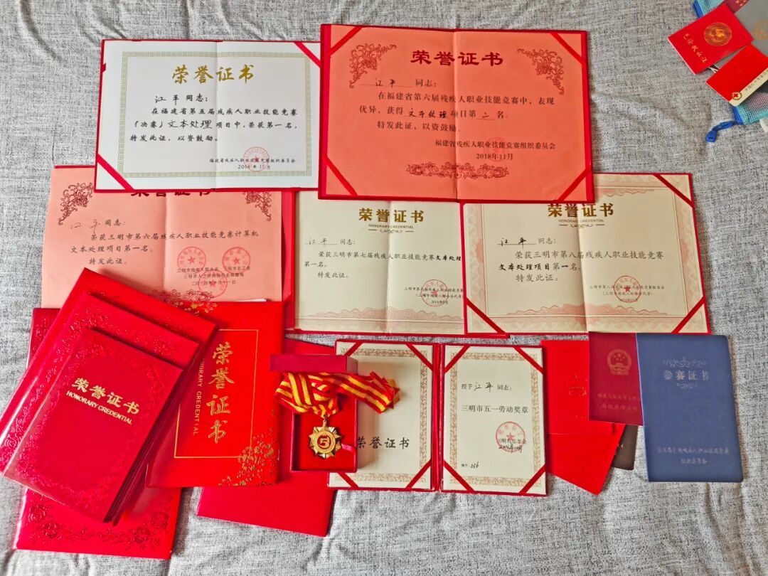 今年57岁的江平,出生于泰宁县杉城镇,在幼年时期因一次发烧导致听力出现障碍。1988年12月开始进入泰宁广播站工作,后广播站经历几次改革,他的工作也随之变到融媒体中心。 2007年, 他参加省残疾人职业技能竞赛并取得优异成绩,成功获得计算机调试员高级技能职业资格证书。 2022年8月, 经省人社局考核认定,他获得计算机操作员高级技师资格证书。 身体的困境从未将他打倒,工作、计算机、体育运动、围棋都是他的拿手好戏。他曾多次参加省市级技能大赛,奖杯和证书塞满了家中的抽屉。