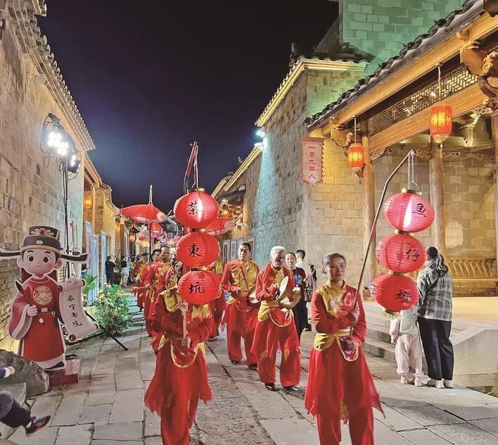 泰宁热气球项目吸引游客打卡。 走进福建(泰宁)乡村非遗博览苑,游客们正在非遗代表性传承人的指导下亲手体验棕编技艺。“没想到在县城能看到这么多非遗展品。”张舒琴感慨道,“孩子玩得开心,我也长了见识。”普通的棕榈叶在巧手翻飞间,化作栩栩如生的蚱蜢、小鸟。 该博览苑凭借出色的展示与互动体验,获评“福建最美公共文化新空间”及长三角“百佳公共文化空间奖”,年接待游客超过10万人次。 业态破圈 多维度激发非遗活力 每逢佳节,上青古乐、傩舞、山歌擂茶等非遗节目轮番上演,国家级非物质文化遗产梅林戏的演出更是场场爆满,让千年非遗“火”在了当下。 传统非遗的精彩演绎,与现代生活的烟火气息在古城中和谐共生。大金湖渔城内人声鼎沸,烧烤的香气与游浆豆腐、碧玉卷等本地小吃的味道在空气中交织,勾勒出浓浓的市井风情。九举巷内,传统怀旧与现代新潮氛围相映成趣,“一乡一馆”特色店铺林立成为市民游客夜间休闲打卡的热门去处。