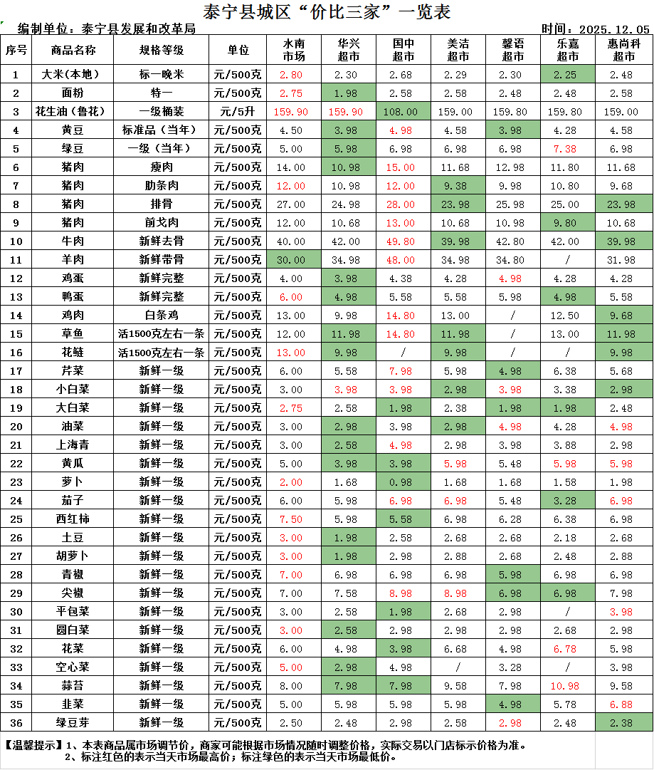 近期,为做好重要民生商品保障需求,保持市场价格稳定,维护正常市场秩序,县发改局从城区水南市场、华兴超市、国中超市、美洁超市、馨语超市、乐嘉超市、惠尚科超市抽取当天36种商品的价格,通过价格对比,让广大市民直观地看到货品价格。