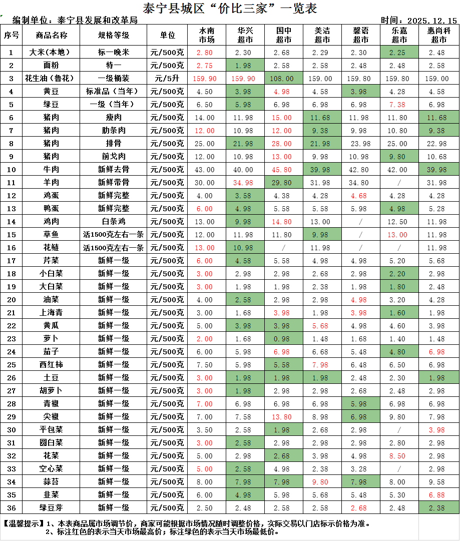 近期,为做好重要民生商品保障需求,保持市场价格稳定,维护正常市场秩序,县发改局从城区水南市场、华兴超市、国中超市、美洁超市、馨语超市、乐嘉超市、惠尚科超市抽取当天36种商品的价格,通过价格对比,让广大市民直观地看到货品价格。