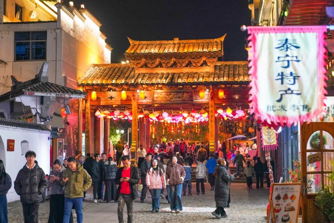泰宁将尚书第夜游、非遗展演、实景演绎、戏曲展演等十余项夜间文化体验项目串联成线,让古城不再只是静默的历史空间,更化身为一座可触摸、可参与、可沉浸的活态非遗展厅。 传统非遗的精彩演绎,与现代生活的烟火气息在古城和谐共生。大金湖渔城内人声鼎沸,烧烤的香气与游浆豆腐、碧玉卷等本地小吃的味道在空气中交织,勾勒出浓浓的市井风情。九举巷内,传统怀旧与现代新潮氛围相映成趣,“一乡一馆”特色店铺林立成为市民游客夜间休闲打卡的热门去处。