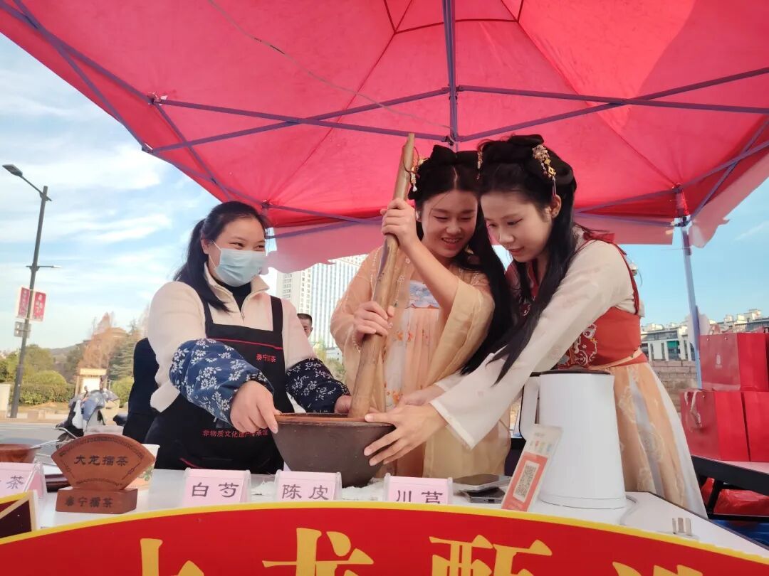 广场上,10多个摊位井然有序,暖菇包、状元糍、碧玉卷等泰宁经典小吃扎堆亮相。蒸腾的热气里飘着鼠曲草的清香、花生糖粉的甜润,还有擂茶的醇厚。 “没想到小小一碗大龙擂茶里面竟然有这么多门道,既能喝又能玩,太有意思了!”来自福州的游客严婷正跟着摊主学做擂茶,一根茶杵在陶钵里研磨着茶叶、芝麻、花生在力道下渐渐融合,香气扑鼻。