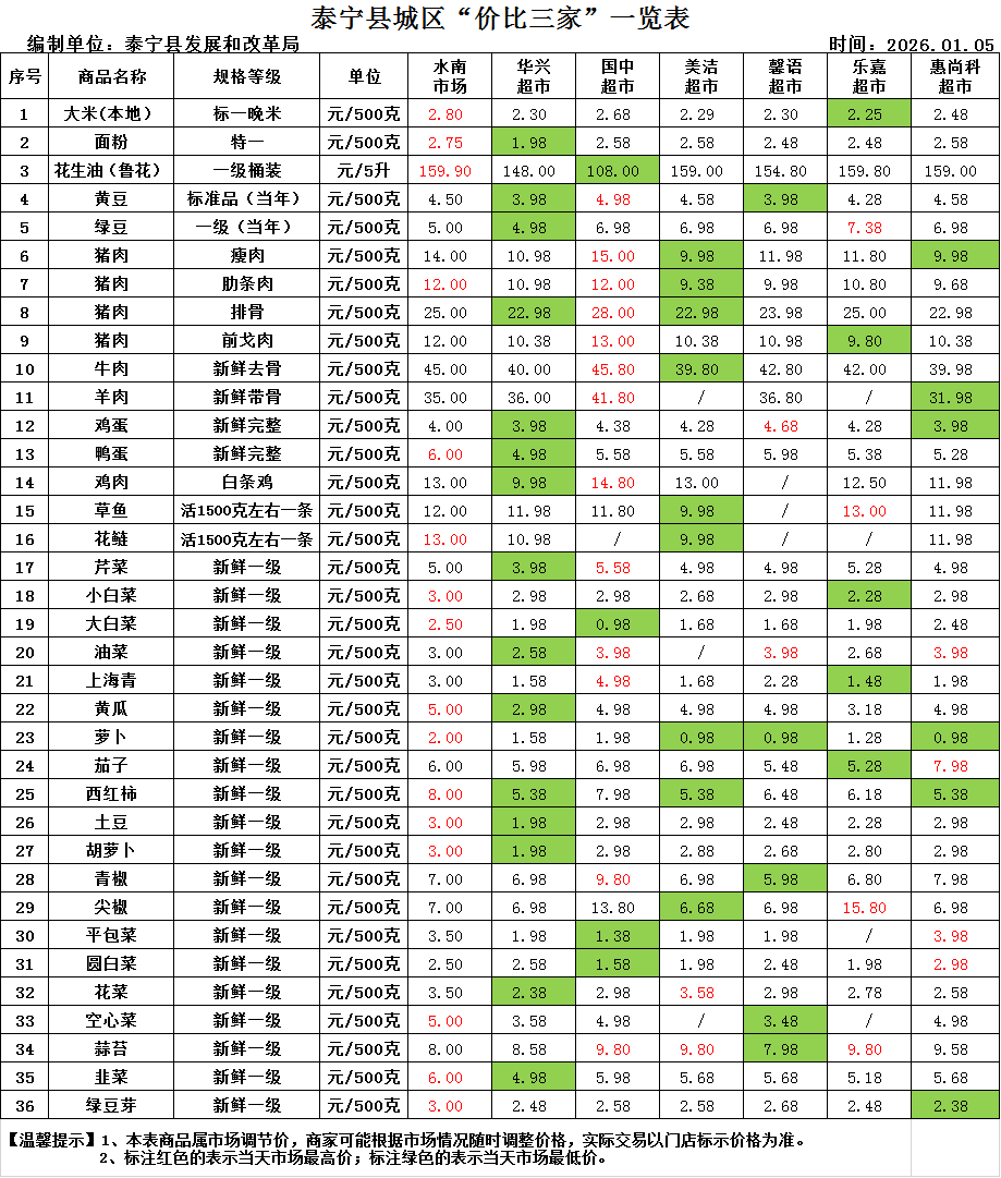 近期,为做好重要民生商品保障需求,保持市场价格稳定,维护正常市场秩序,县发改局从城区水南市场、华兴超市、国中超市、美洁超市、馨语超市、乐嘉超市、惠尚科超市抽取当天36种商品的价格,通过价格对比,让广大市民直观地看到货品价格。