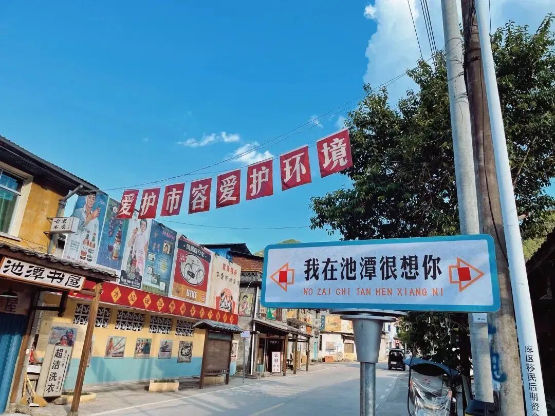 20世纪70年代,池潭水电站动工,池潭村随之跃入“高光”。常住人口突破2万,商店、饭棚、旅馆、厂房鳞次栉比,圩日、独立邮编一应俱全,留下了大量完好的20世纪七八十年代工业厂房、传统民居和老街。如今,旧建筑“封存”年代记忆,新村貌舒展整洁画卷,历史肌理与秀美山水相映成趣,成就了一座“80年代天然影视片场”。