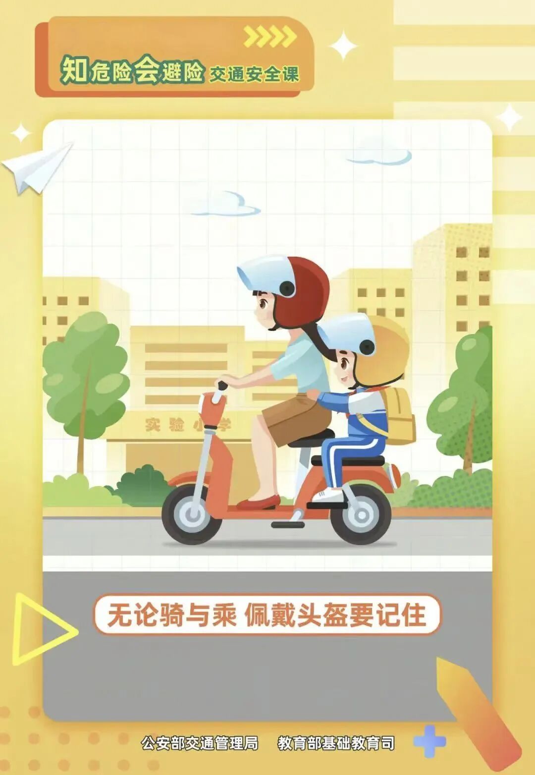 以下整理了一些 交通安全的干货 快来巩固一下 这些极其重要的知识吧! 一、遵守交通规则牢记规则,守好安全防线 1.遵守交通规则,不逆行、不闯红灯,骑非机动车道、与大型机动车保持距离。 2.不要违规载人,骑乘电动自行车要做到按规定载人。电动自行车稳定性降低,违规载人容易发生交通事故。 3.如遇右侧违停车辆,或前方车辆突然加速或靠边停车的情况,切勿随意变道或超车,应先观察后方有无来车,再减速保持距离通过,距离应间隔一个车位。 4.过路口要减速,以防交叉路口突然冲出物体(别管主责和次责)保命第一。 5.不超速,《中华人民共和国道路交通安全法》第五十八条:“残疾人机动轮椅车、电动自行车在非机动车道内行驶时,最高时速不得超过十五公里 。” 二、严格佩戴安全头盔 安全头盔是保障生命安全的最后防线。 骑乘电动自行车一旦发生意外,车上人员容易直接接触地面,而最先着地的往往便是头部。头部是人体较为脆弱的部位,只要受到碰撞,很容易造成颅脑损伤。 在发生意外时,头盔可以大大减轻头部受到的伤害。 因此,驾乘摩托车、电动自行车必须正确佩戴安全头盔!