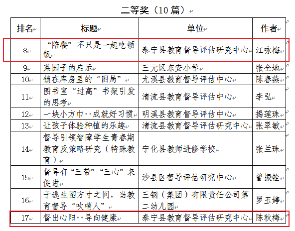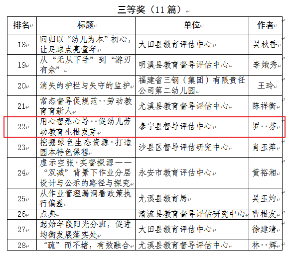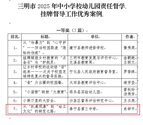 近日,三明市2025年中小学校幼儿园责任督学挂牌督导工作优秀案例评选结果揭晓,全市共28篇案例获奖,泰宁县有4篇案例获奖,其中肖钟平督学撰写的《从“趴桌现象”到“站立文化”的转变之路》获市一等奖,江咏梅督学撰写的《“陪餐”不只是一起吃顿饭》、陈秋梅督学撰写的《督出心阳 导向健康》获二等奖,罗芬督学撰写的《用心督悉心导 促幼儿劳动教育生根发芽》获三等奖。