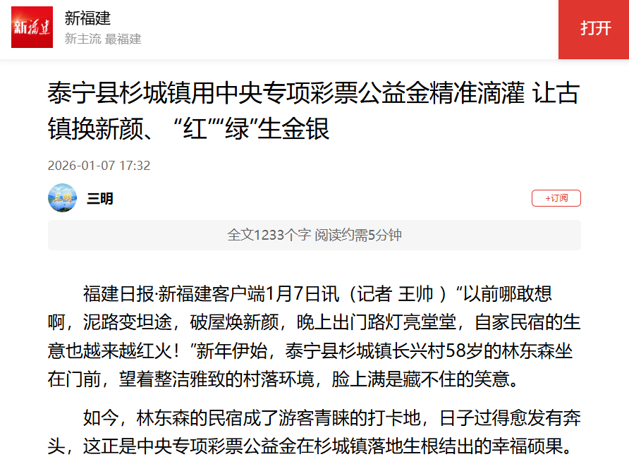 “以前哪敢想啊,泥路变坦途,破屋焕新颜,晚上出门路灯亮堂堂,自家民宿的生意也越来越红火!”新年伊始,泰宁县杉城镇长兴村58岁的林东森坐在门前,望着整洁雅致的村落环境,脸上满是藏不住的笑意。 如今, 林东森的民宿成了游客青睐的打卡地, 日子过得愈发有奔头, 这正是中央专项彩票公益金 在杉城镇落地生根结出的幸福硕果。 作为泰宁县全域旅游核心区和产业转型示范区,杉城镇立足“八山一水一分田”的自然禀赋与“汉唐古镇、两宋名城”的深厚文脉,将4000万元中央专项彩票公益金精准投向产业升级、基建完善与民生改善三大领域,围绕“一心两轴三片区”规划,串起9个建制村打造集中连片发展示范带,让这片红色土地焕发蓬勃生机,走出了一条具有闽北特色的乡村振兴之路。