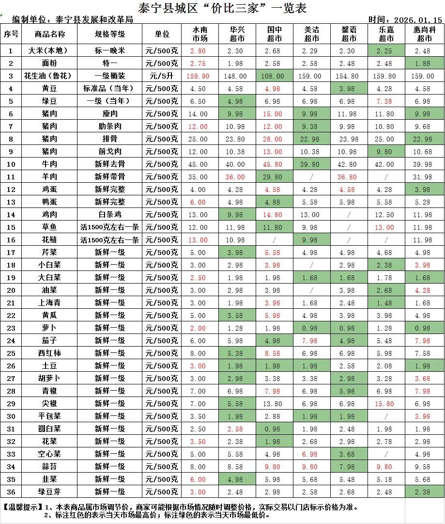 近期,为做好重要民生商品保障需求,保持市场价格稳定,维护正常市场秩序,县发改局从城区水南市场、华兴超市、国中超市、美洁超市、馨语超市、乐嘉超市、惠尚科超市抽取当天36种商品的价格,通过价格对比,让广大市民直观地看到货品价格。