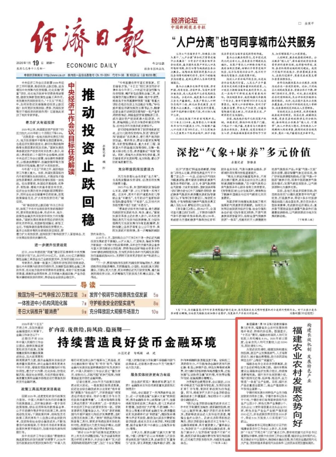 1月19日,《经济日报》头版刊发《福建农业农村发展态势向好》。详情如下——
