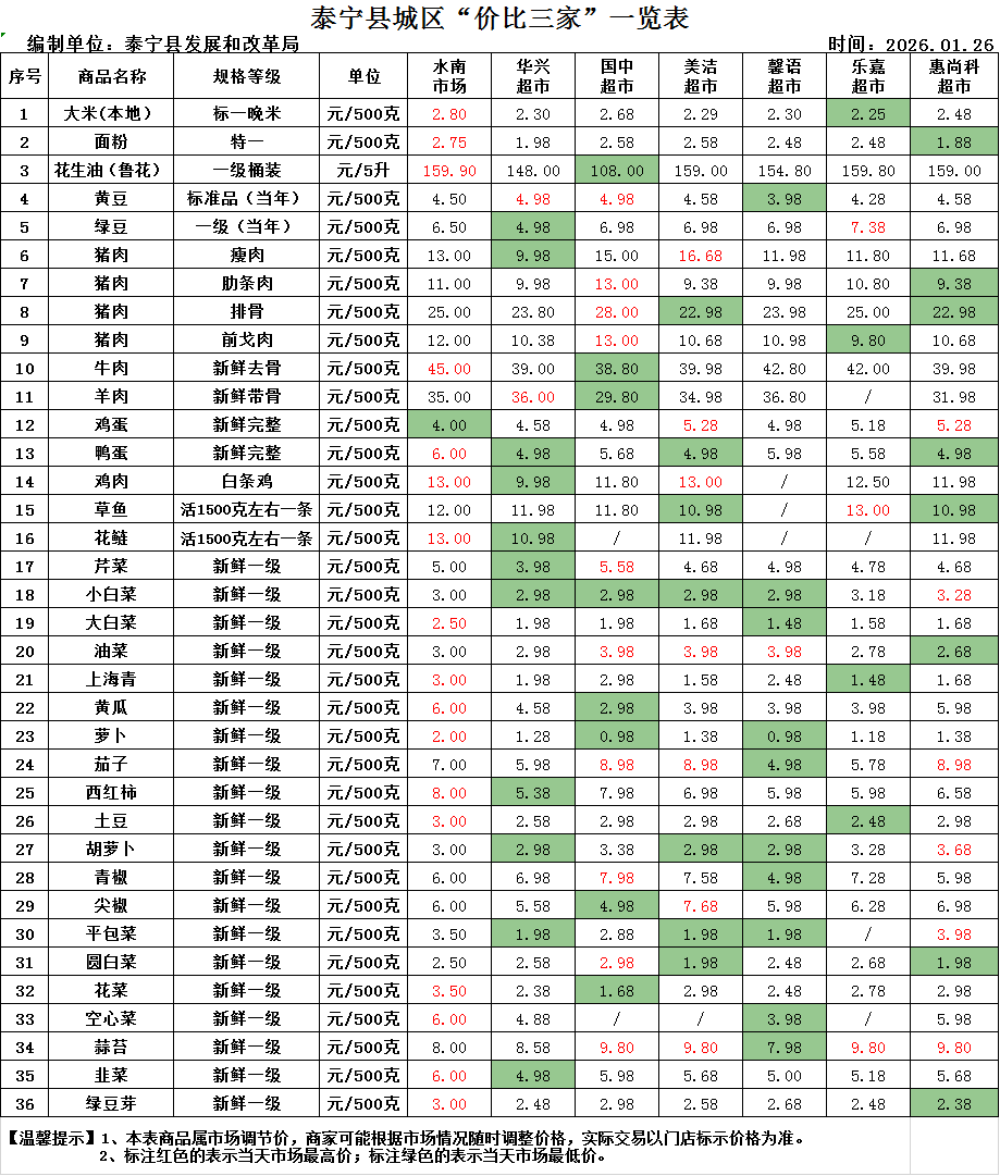近期,为做好重要民生商品保障需求,保持市场价格稳定,维护正常市场秩序,县发改局从城区水南市场、华兴超市、国中超市、美洁超市、馨语超市、乐嘉超市、惠尚科超市抽取当天36种商品的价格,通过价格对比,让广大市民直观地看到货品价格。