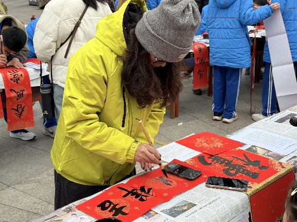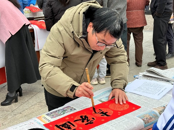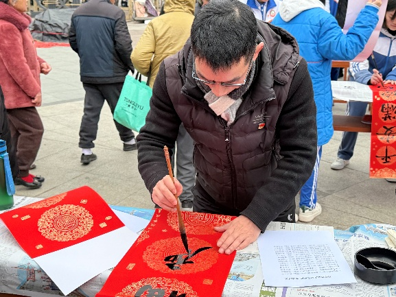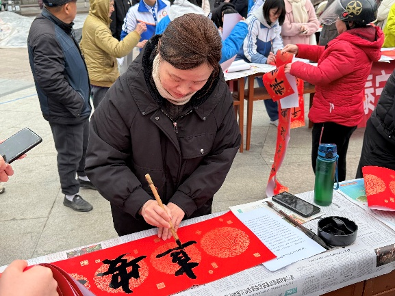 往来市民驻足围观、有序领取,一张张喜庆的“福”字、一副副红火的春联送到群众手中,欢声笑语不断,年味愈发浓厚。