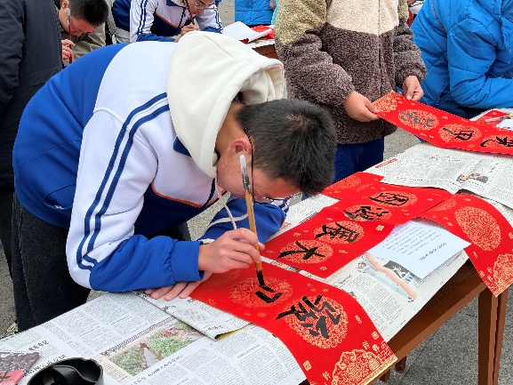 活动现场暖意融融、墨香四溢。学校党员教师、团员师生、家长志愿者与书法爱好者齐聚一堂,铺展红纸、饱蘸浓墨,凝神运笔、挥毫泼墨。一幅幅对仗工整、寓意吉祥的春联跃然纸上,一句句饱含祝福、贴近生活的联语承载美好期盼,既有辞旧迎新的传统韵味,也有立德树人、奋进新程的教育情怀。