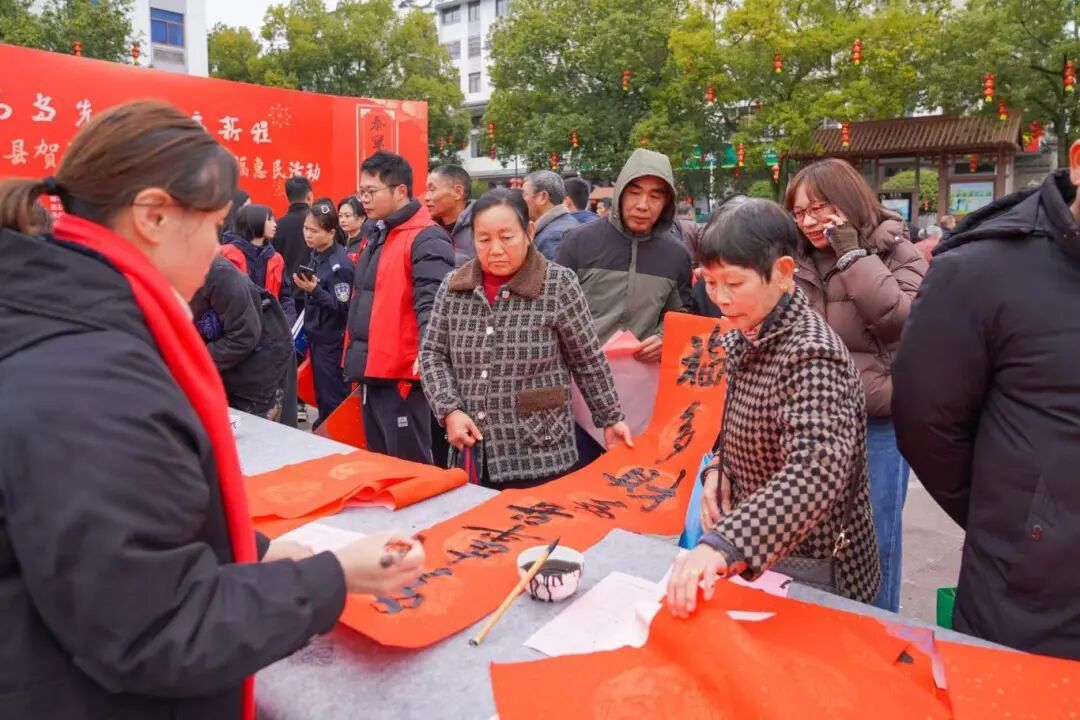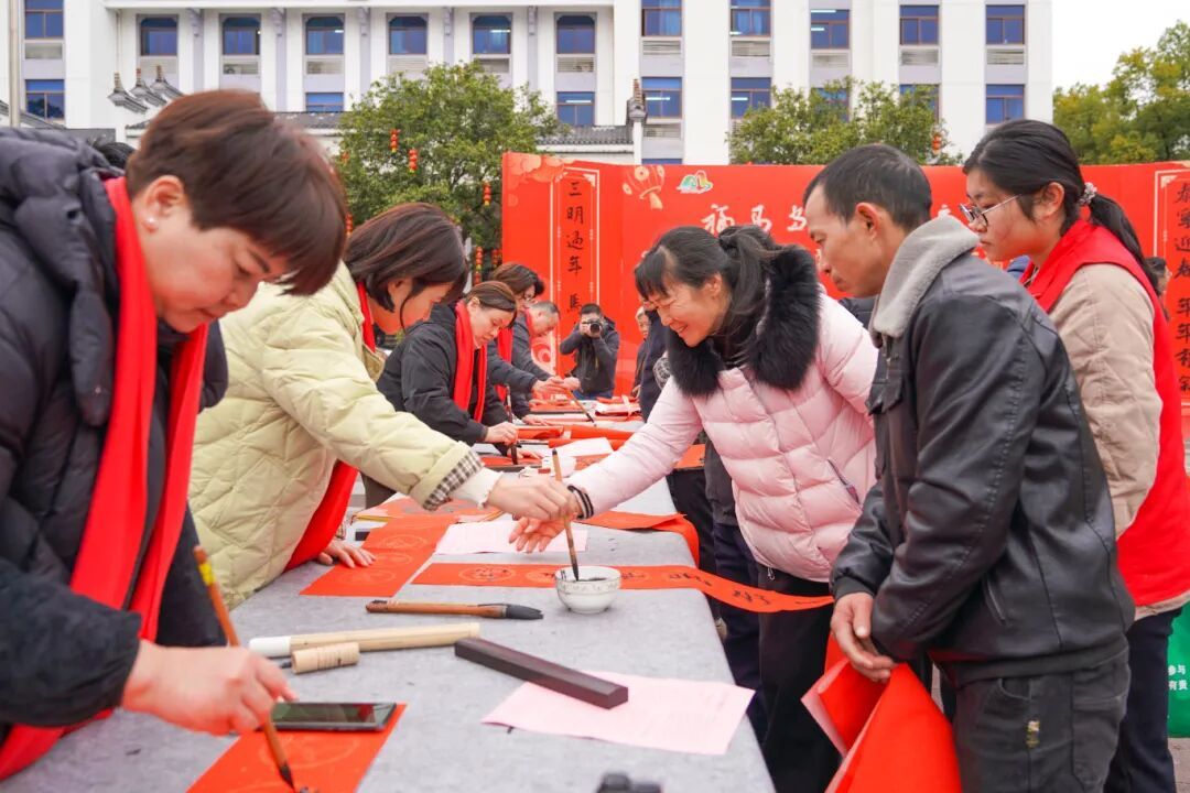 活动现场红纸铺展、墨香四溢。书法家们挥毫泼墨,笔走龙蛇,一副副寓意吉祥、满载祝福的春联和一个个苍劲有力的“福”字在他们的笔下诞生。市民们有序排队领取,脸上洋溢着喜悦的笑容,广场上处处散发着喜庆祥和的节日气氛。