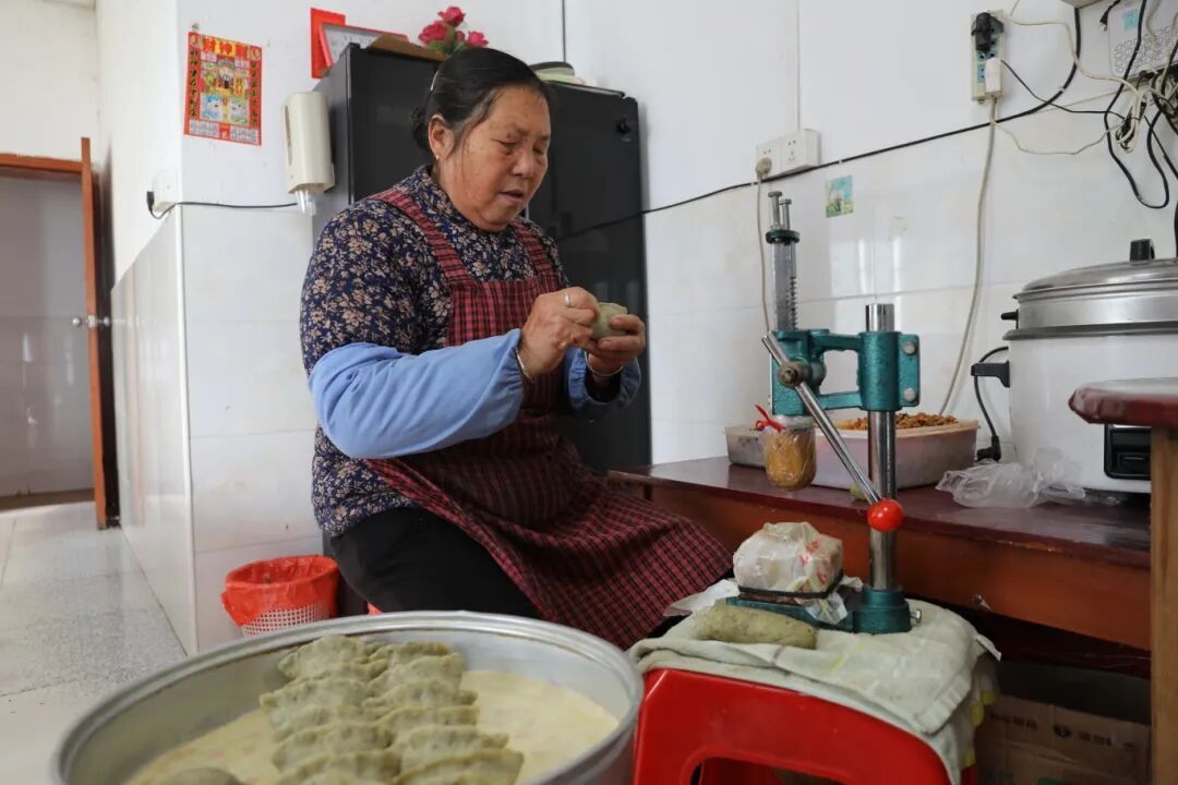 这抹绿色,来自泰宁山野间的暖菇(又称鼠曲草)。每年清明前后,田埂边、山坡上随处可见这种带着绒毛的小草,摘下嫩叶洗净,与浸好的米一起磨成浆,熬煮后定型,便有了这独特的绿色面皮。 一道乡愁情 “许阿姨,今天的暖菇包好了没?” “就等你了,刚出笼的!” 洋发村地处龙湖工业园区与泰宁城区之间,往来货车司机多,许一娥的暖菇包成了司机们歇脚时的“标配”。