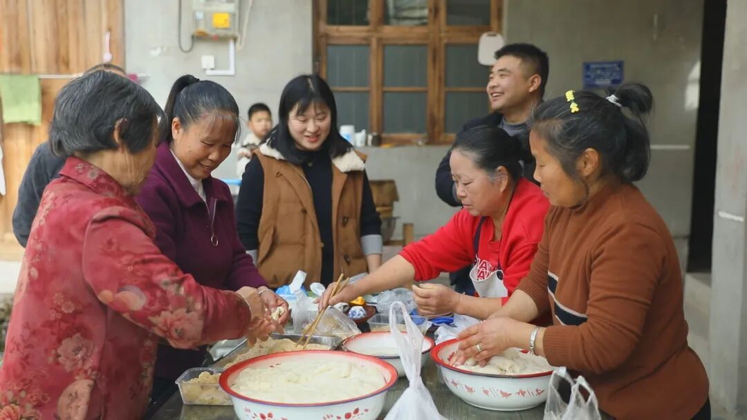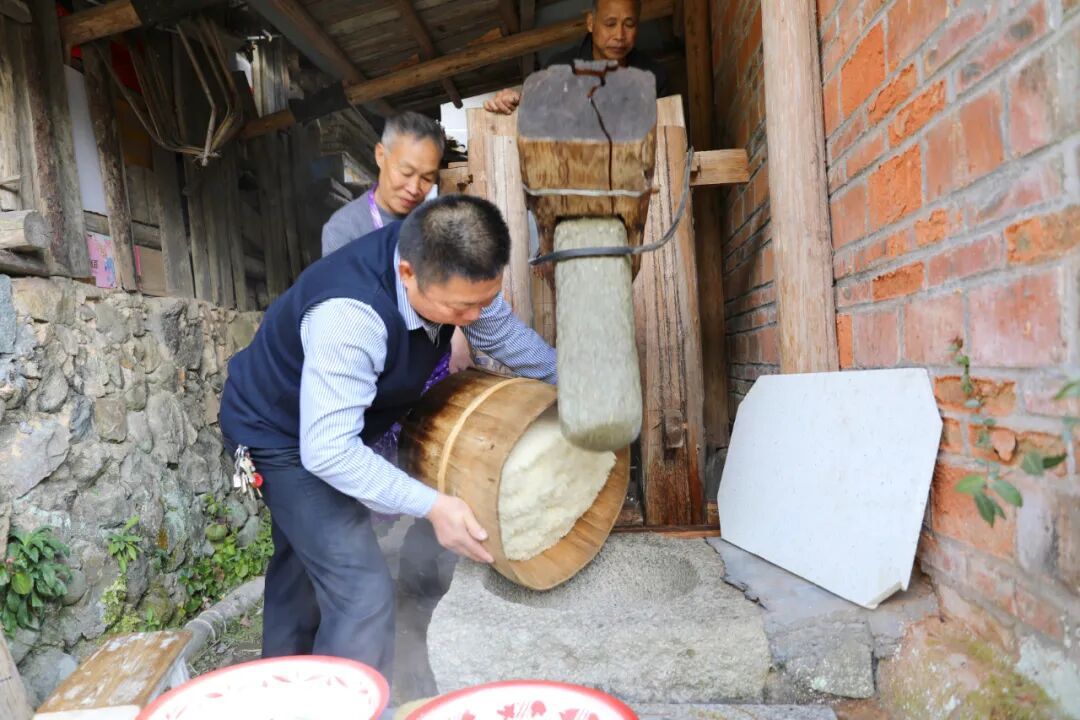 2月15日,泰宁县杉城镇大坪村的广场上热气缭绕、米香弥漫。村民们围聚在传统石臼旁,木槌起落有序的捶打声与阵阵欢笑声交织成一片暖意融融的景象。