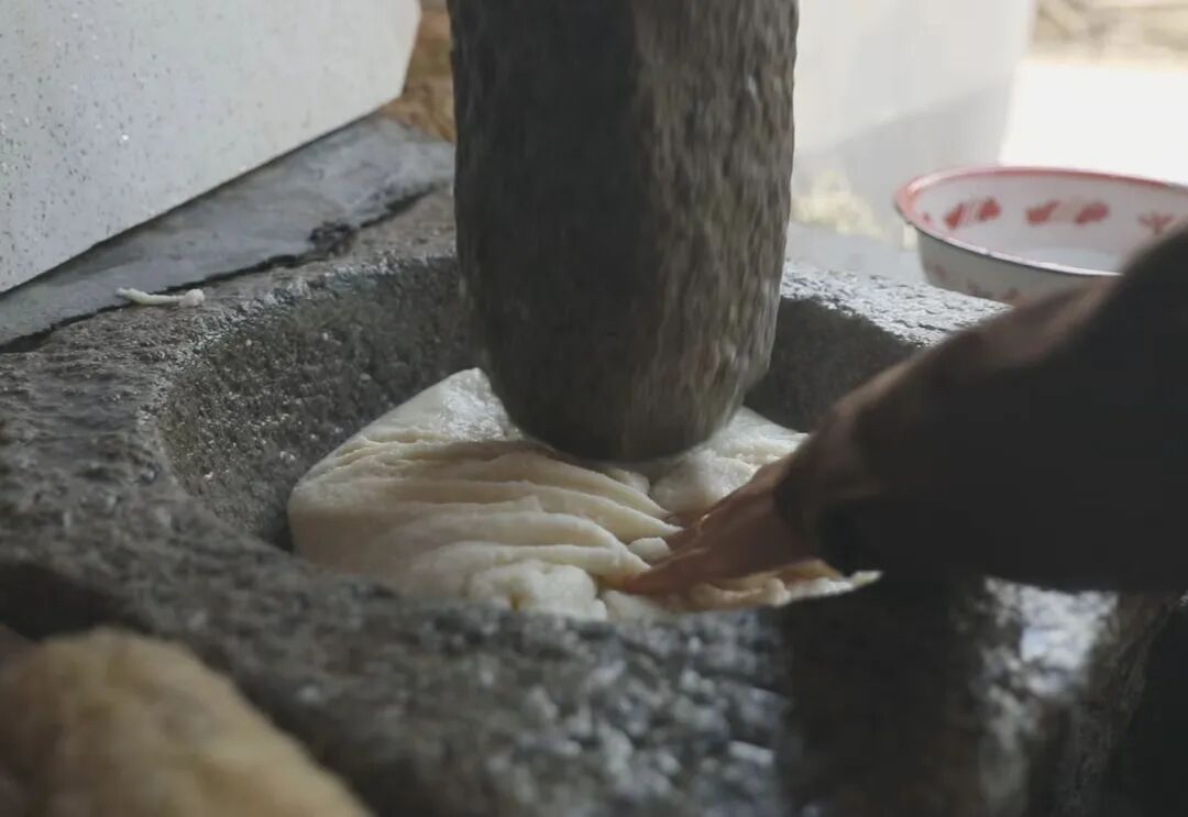 待糯米蒸至晶莹饱满、香气四溢时,便进入最关键的一步——捶打。滚烫的糯米被迅速倒入洗净的石臼,几位师傅合力踩动沉重的木槌,趁热交替捶捣。直至米粒完全融合,变得绵软柔韧、洁白如玉。