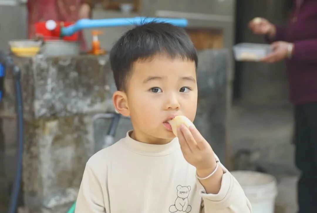 来帮忙的李大爷说起自己小时候:“那时候哪有现在这么多零食,最盼的就是过年打糍粑。我们几个小孩就蹲在这儿等,趁大人转身,偷偷从边上揪一小团就跑,烫得左手倒右手,边跑边往嘴里塞。我娘在后头喊,‘别光吃白糍粑,裹点豆粉呀!’”话音落下,周围人都笑起来。