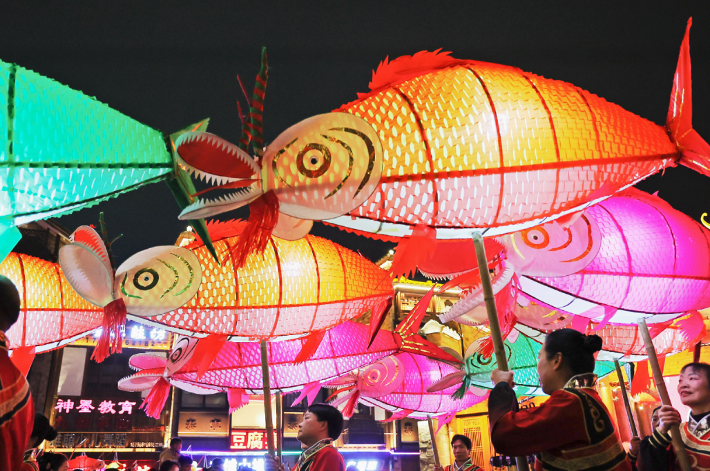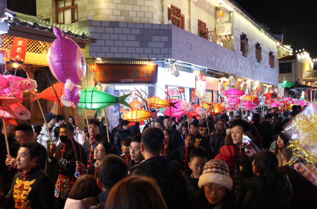 2月18日,“马上有福 年年有鱼”泰宁点灯·非遗鱼子灯展演在民俗文化广场热闹举行,市民与游客欢聚一堂,沉浸式感受泰宁古城浓郁的传统年味。