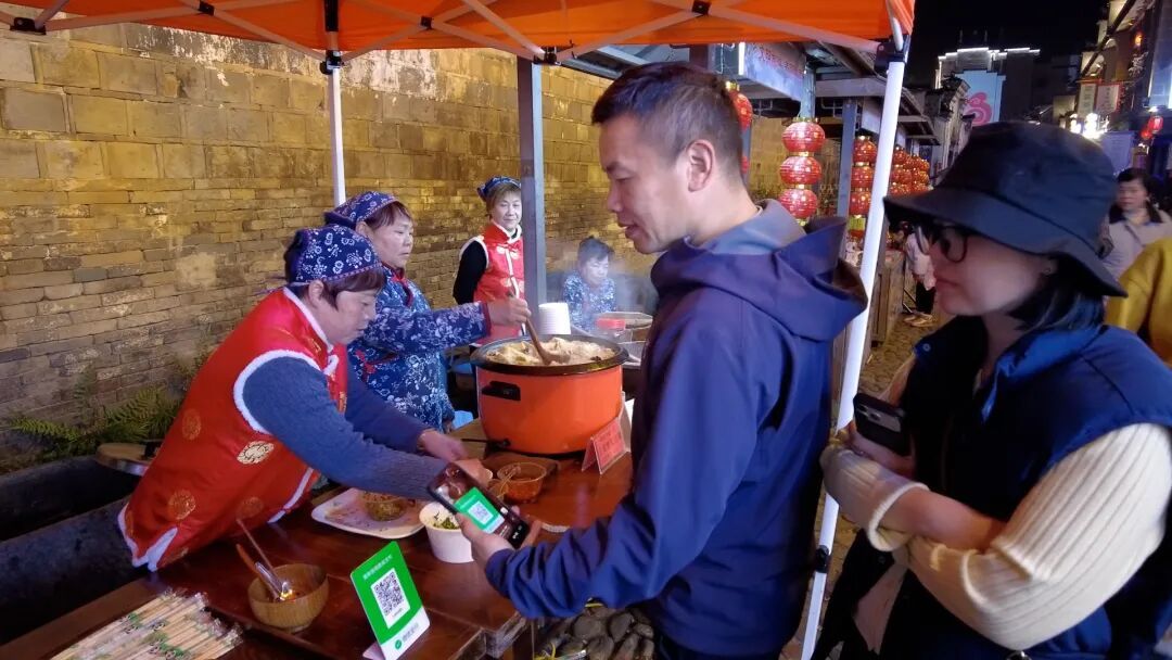 最为热闹的当属非遗美食区。擂茶摊位前香气四溢,游客们手捧茶碗,细细品味着这一传统饮品的醇厚滋味。几步之遥,游浆豆腐的摊主正熟练地操作雪白嫩滑的豆腐新鲜出锅,引来众多食客排队品尝。