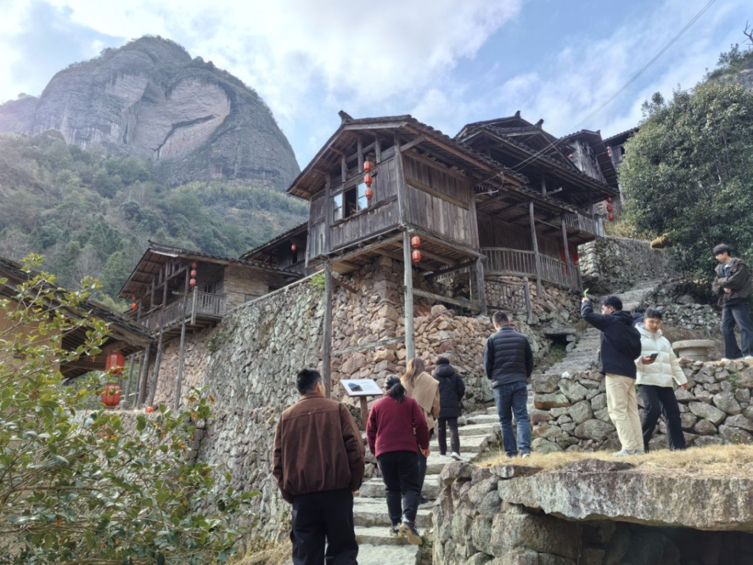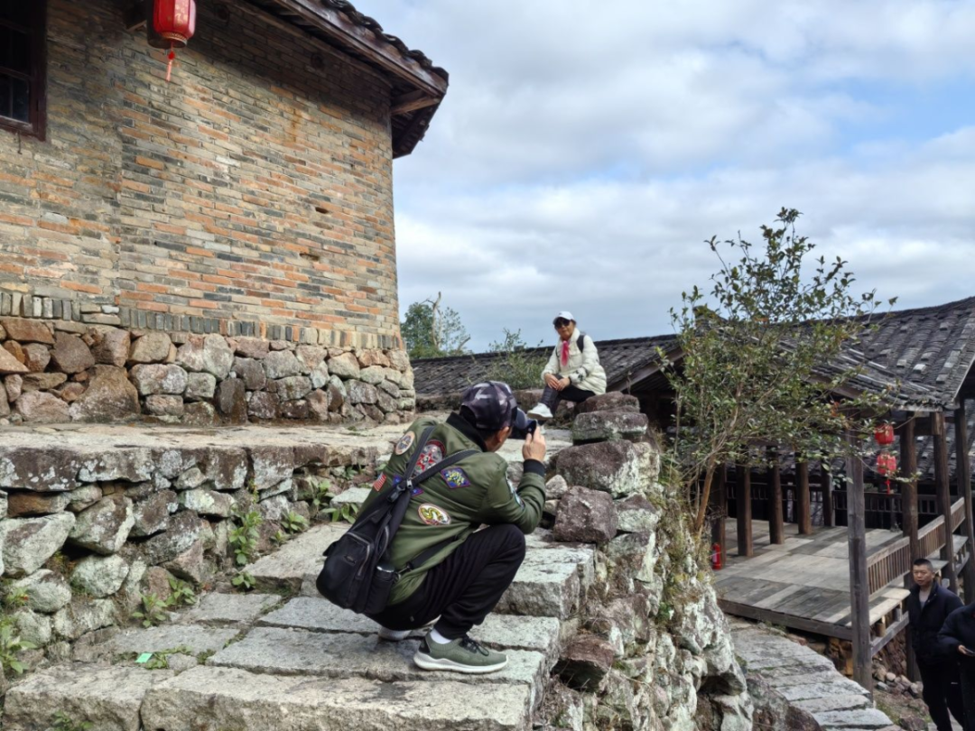 来自福州的游客陈先生搓着微微冻红的手,呵着白气笑道:“在龙王岩看新年的第一缕阳光,这仪式感前所未有。” 龙王岩以“运动+生态”为切入点,将登山健身与观光摄影深度融合,让“登高望远”成为新春文旅的新风尚,暴涨的客流量为里坑村带来了源源不断的人气。 老虎际:古村活化引客来 沿着龙王岩下山,转入老虎际古村落,青石板路两旁,百年老屋的门框上贴着簇新的红对联,屋檐下挂着古法制作的红灯笼。大人们则围坐在古寨茶室前,就着山泉水泡的本地岩茶话家常。