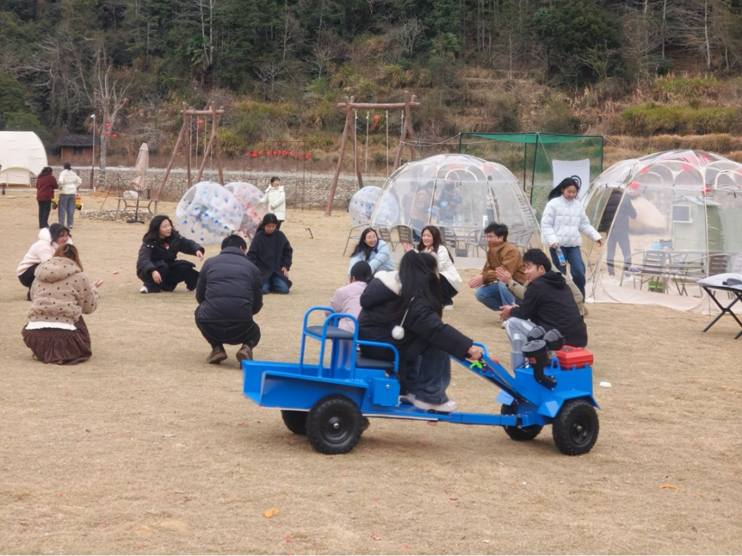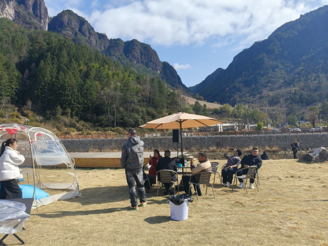 景区还贴心设置了两条游览线路,一条轻松休闲,适合亲子体验;而另一条则挑战十足,适合登山探险。春节期间也有不少户外爱好者选择向八仙崖发起新年第一场“徒步挑战”。 双坪营地:业态创新聚人气 双坪的远山近水山野星空营地里,早已热闹非凡。天幕帐篷错落有致,红灯笼串在空中摇曳。孩子们在儿童乐园攀爬嬉戏,大人们围坐在烧烤架前翻动着肉串,欢笑声中弥漫着孜然与草木混合的香气。 “我们特意从厦门过来的,就想换个方式过年,”在营地一角,正在煮手冲咖啡的游客王女士笑着说,“上午到爬山看日出,下午就想找个地方放松一下,这里景色优美、娱乐设施丰富,晚上还能在星空下K歌、点篝火,孩子们玩得不想走,大人也能彻底放松。”