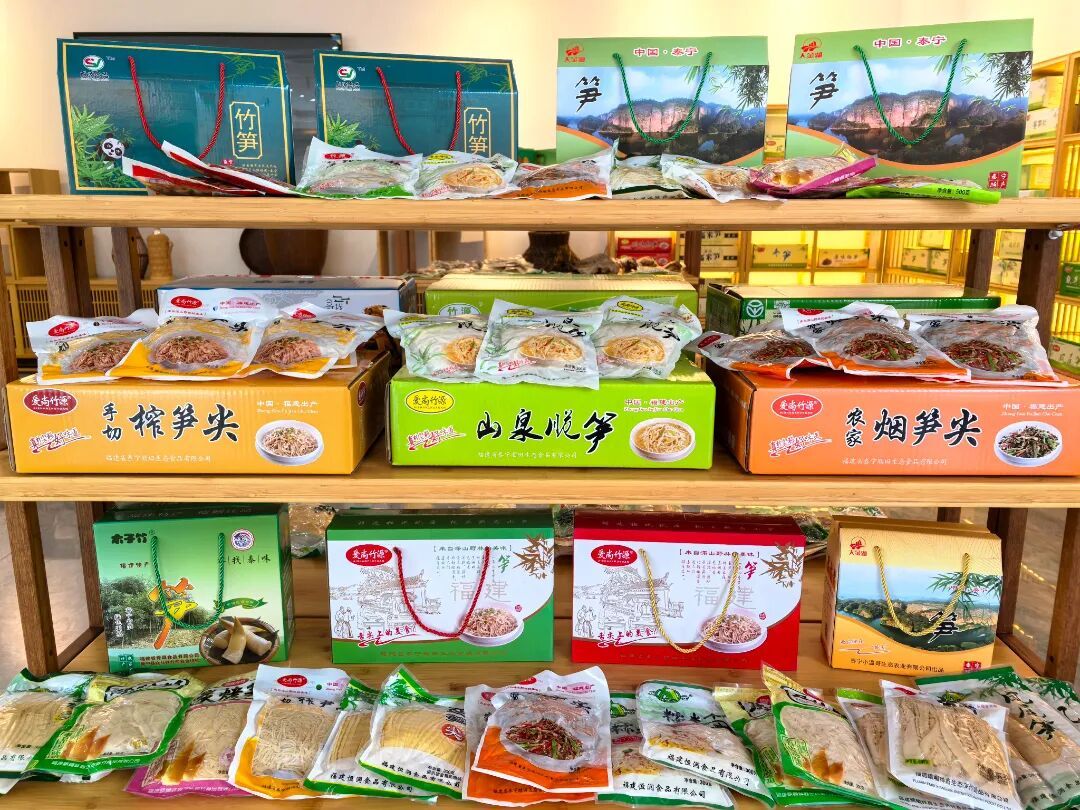 大田笋的名气,每年都吸引众多笋商前来选购,交易市场还建起了展销中心。展厅中,福建省泰宁顺田生态食品、福建峨嵋祥鑫生态笋竹食品、福建恒润食品、福建省清源食品等企业的各类笋品一一陈列,玉兰笋尖、农家烟笋、烤笋干、糯米笋等笋制品应有尽有。为方便客人选购,货架上还放置了二维码,不用大箱小箱打包带走,只需指尖轻点,就能在家中收获这份来自泰宁大山的鲜美馈赠。 站在交易市场向对面望去,就能看到福建省泰宁顺田生态食品有限公司。车间里,工人们正在赶制订单,为“山珍”销售热潮做好准备。 公司产品包括片笋、脆笋、烟笋等,销往广州、武汉、南昌等地,年产值200多万元。公司投资70余万元引进全自动灌包生产线、高温灭菌锅等设备,实现加工技改提升,年生产袋装笋可达2000吨,大大提增产业效益。 全竹利用 释放产业活力 眼下,泰宁县30余万亩的竹林,积蓄着拔地而起的力量。 一根毛竹的生长周期,诠释着不同价值——鲜笋是当下可变现的金银,毛竹是日后可取的本金和利息,而产业链的延伸,决定了这份“生态财富”的“增值空间”。