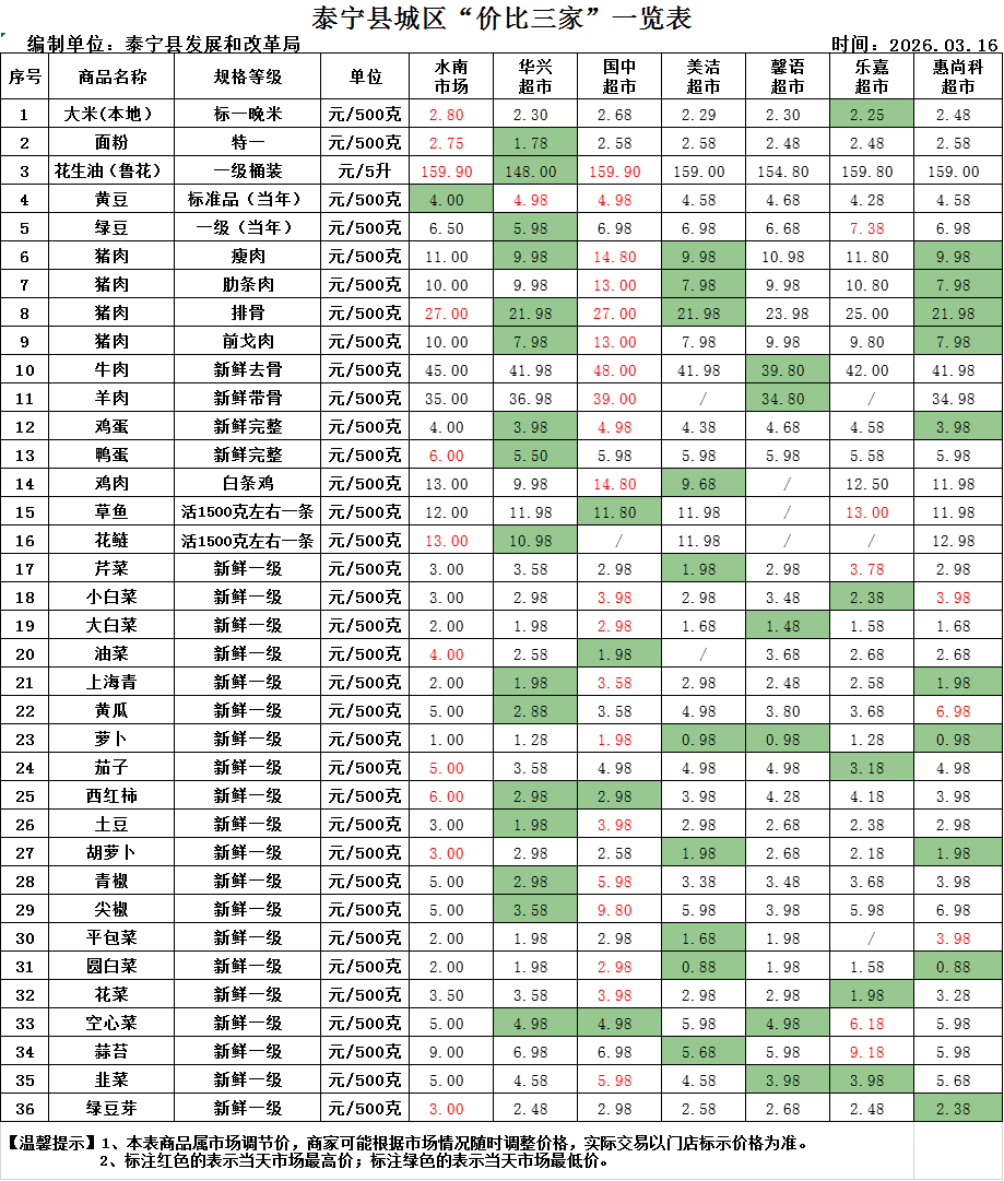 近期,为做好重要民生商品保障需求,保持市场价格稳定,维护正常市场秩序,县发改局从城区水南市场、华兴超市、国中超市、美洁超市、馨语超市、乐嘉超市、惠尚科超市抽取当天36种商品的价格,通过价格对比,让广大市民直观地看到货品价格。