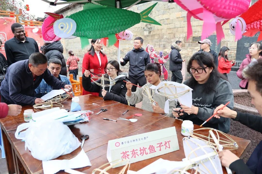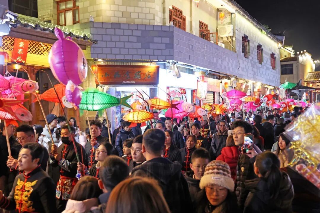 金溪夜游 流光映古城 非遗焕彩 烟火生金 泰宁古城的韵味, 藏在老手艺人的指尖, 也融进了街头巷尾的烟火气里。 古巷里, 非遗代表性传承人展示鱼子灯制作技艺,弯曲竹条、缠绕丝线、剪贴鱼鳞,直至点亮灯光。老手艺的传承,在互动中吸引青春面孔。 古巷里,棕编师傅的摊位前,深浅不一的棕榈叶片垂挂台前,各种编织好的小动物栩栩如生,引得游客跃跃欲试。