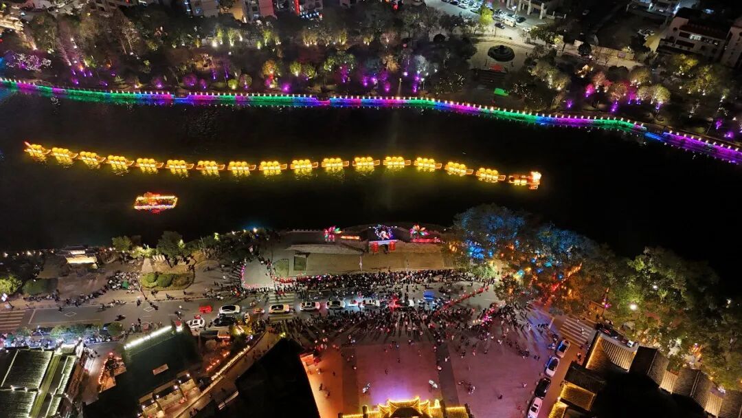 九龙潭火锅宴受热捧 与此同时,十里金溪夜游也在夜幕中闪耀登场。作为全市唯一以内河为载体的大型沉浸式夜游示范项目,5公里碧水为轴,声光电、水幕投影、真人实景演绎轮番上阵。游船缓缓前行,击鼓鸣志、两宋状元情、梅林古戏、傩舞狂歌等九幕场景次第展开。金溪夜游聚焦古城文脉与非遗传承,九龙潭自然山水间的光影之美形成差异互补,为游客提供了两种截然不同的夜游体验。