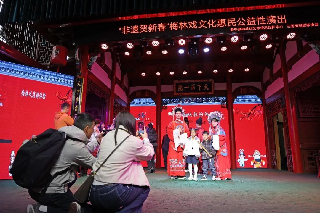 游客体验梅林戏妆造 光影织梦 日游夜欢 每逢假日, 泰宁县各景区便早早迎来客流高峰。 在九龙潭,山水画卷与人文景致交相辉映,景区精心布置的开福门、抱抱树、国风灯笼长廊以及趣味打卡点喜气盈盈,吸引游客驻足留影,用镜头定格下新春的美好瞬间。 不少带着孩子的游客称赞道:“这里韵味十足,打卡点别出心裁,孩子玩得不亦乐乎。”