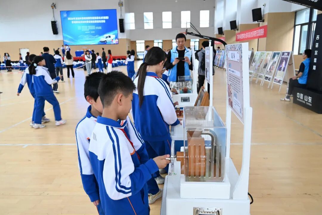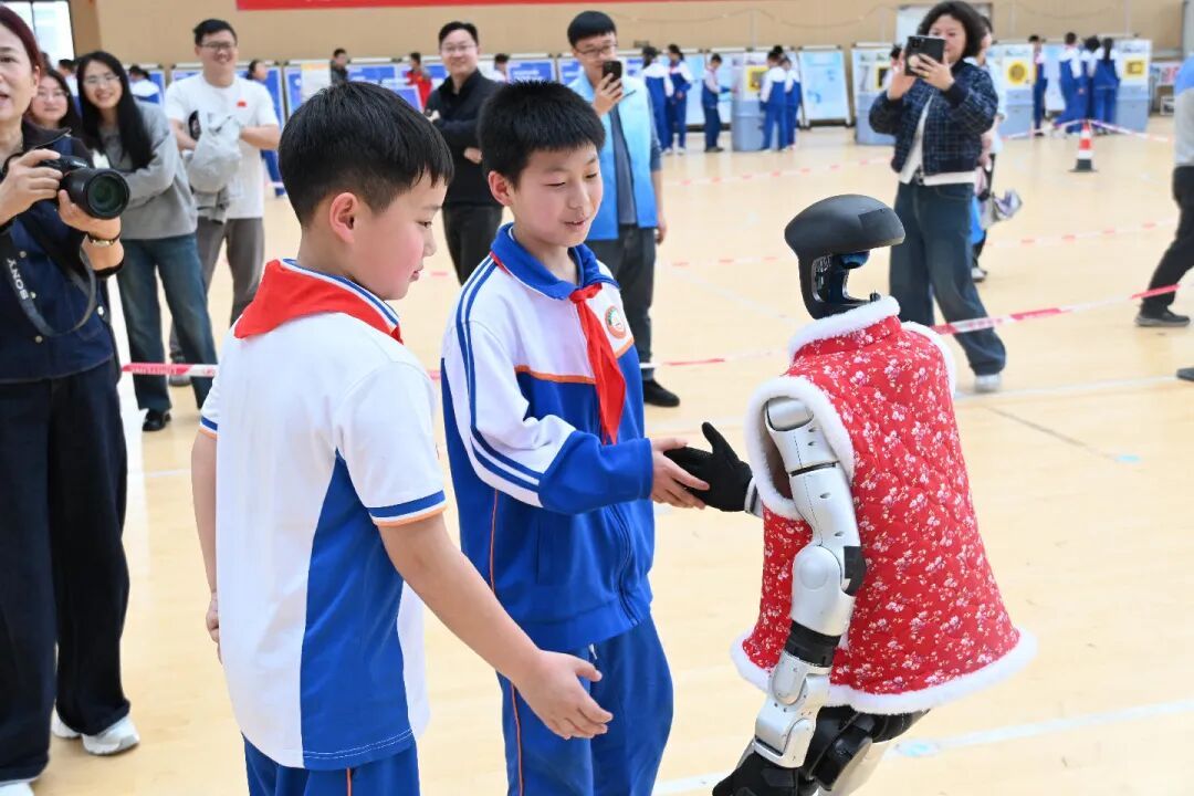 孩子们在各个展台前排起长队,亲手操作、亲身体验,感受科学的神奇。场地中央,伴随着动感音乐,机器人列队起舞,灵动的动作引来同学们阵阵欢呼。