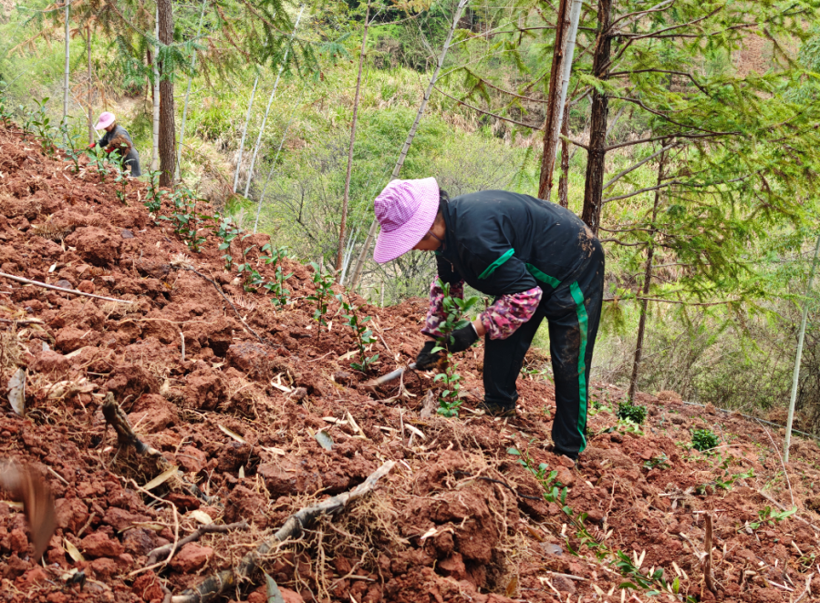 近日,在大龙乡张地村,百亩优质茶叶基地呈现出一派热火朝天的繁忙景象。山坡上,10余名村民正抢抓春季种植黄金期,挥锄挖坑、扶苗培土,种下一株株新茶苗。