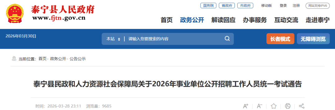 近日, 泰宁县民政和人力资源社会保障局发布 《关于2026年事业单位 公开招聘工作人员统一考试通告》, 计划招聘工作人员63名。