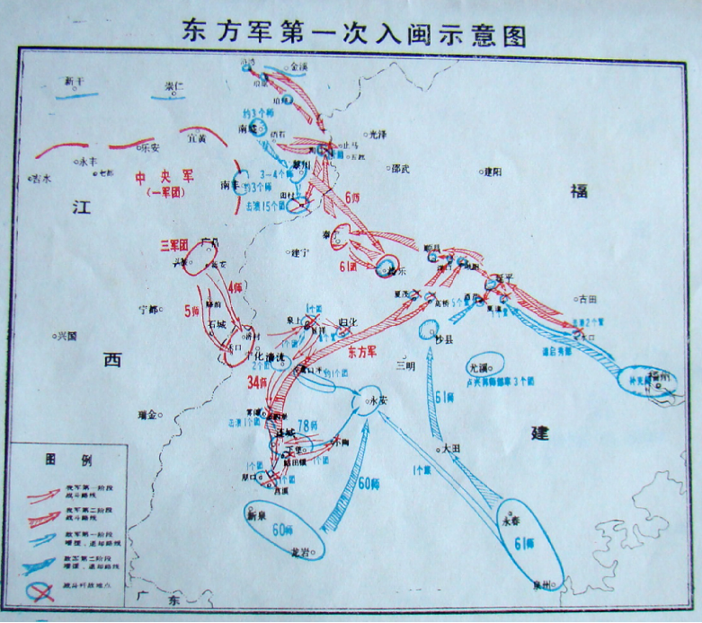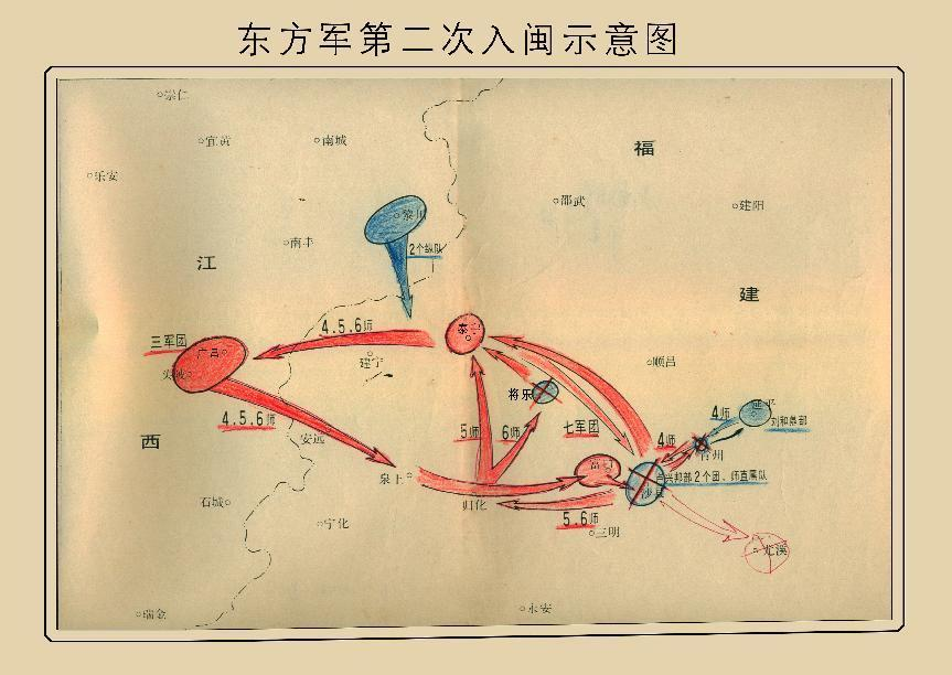 东方军第二次入闽示意图 与泰宁相关重大事件 (1)1933年7月5日,东方军从江西进入宁化禾口一线,进行第一阶段做战。8月中旬,东方军北上闽西北,开始执行第二阶段作战计划,18日,朱德和周恩来率中国工农红军总司令部兼红一方面军司令部抵达泰宁,指挥东方军战斗,东方军司令部设在水南罗汉寺。 (2)1933年8月中旬,驻泰二十一师六十一团编入东方军系列。23日,六十一团离开泰宁,会同红六师围困将乐县城。 (3)1933年9月23日,彭德怀、滕代远和袁国平与国民党十九路军代表陈公培在王台八角楼进行“休战谈判”,十九路军妥协同意:“停止进攻苏区,释放共产党,取消经济封锁”,要求东方军“红军退出洋口,以泰宁、将乐、建宁、清流、连城为国口”。 (4)1933年9月,国民党军向黎川发动突然袭击。27日,东方军奉命从将乐、顺昌撤离,回师就敌,分左、右两路纵队由彭德怀、董振堂率领,于10月4日赶到泰宁新桥和大田集结完毕, 5日,东方军左右两纵队分别从大田、新桥出发,参加收复黎川战斗。 (5)1933年12月20日,中革军委下达《关于转移突击方向和组织三个军及各军动作的指示》,决定“以第5、第7军团及独立第61团和东北各地方部队编为东方军,留在建宁、泰宁、黎川、光泽、金溪一线,开展游击战区战争,钳制和消耗东线之敌。” (6)1934年1月3日,以红三、七军团组建的东方军二次入闽,于1月26日和2月10日分两批从沙县撤回泰宁集结,进行短期休整,2月25日开赴江西南丰以北参战。 战 果 东方军首次入闽作战,共歼敌8个团,俘虏7800多人,缴枪7500余支,以及食盐、煤油、药品等大量物资,“筹款百万,赤化泰宁大部及闽中一大块区域,使泰宁与闽北苏区连成巩固的一片” ,为扩展红色区域、巩固中央苏区作出了重要贡献。同时,与国民党第19路军达成东线休战,促使其走上了联共反蒋的道路,建立“福建人民政府”,取得了显赫战果,泰宁作为东方军入闽作战的战略指挥中心和军事通道,为实现东方军“筹款百万、赤化千里”的战备目的发挥了重要作用。 |