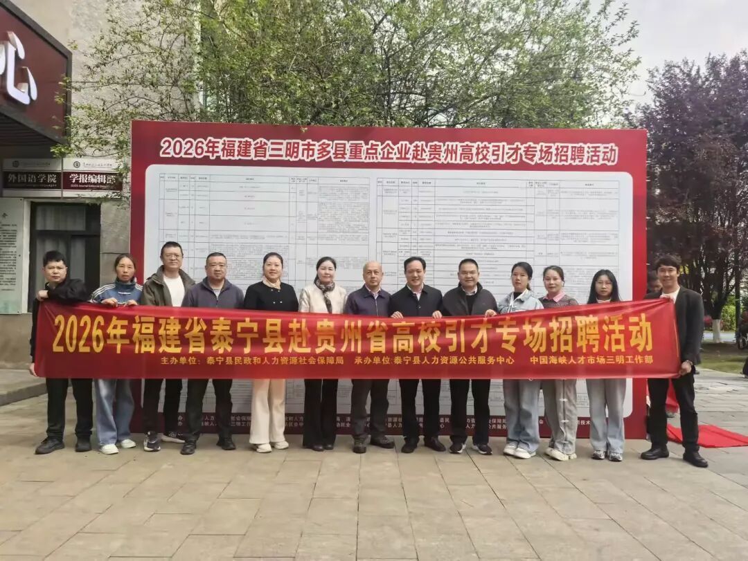 近日,泰宁县民政和人力资源社会保障局联合泰宁县总工会带领福建省泰华生物科技有限公司、福建新创艺竹木科技有限公司、福建省泰宁盛源食品有限公司等6家本地优质企业,赴贵州省三所院校开展专场招聘活动,搭建校地人才对接桥梁,破解企业人才供需难题。