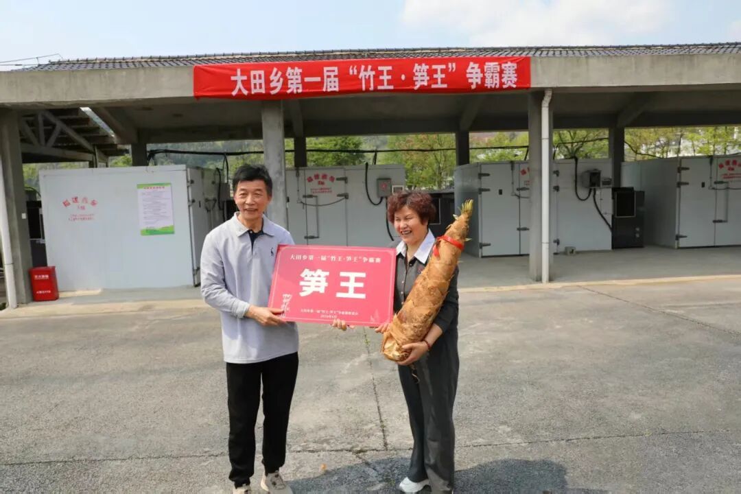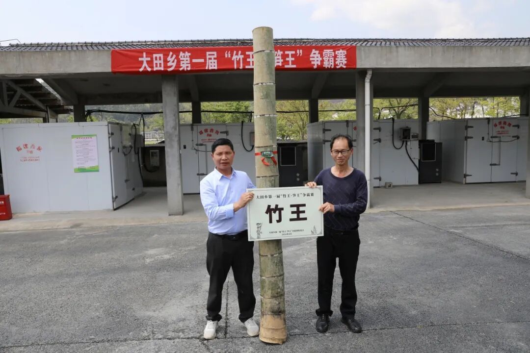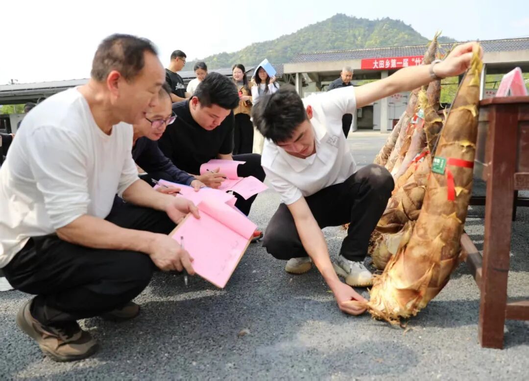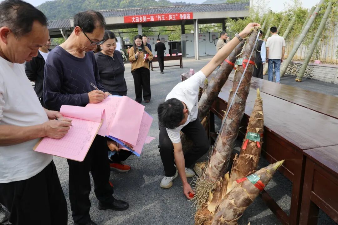 赛事现场 4月9日,大田乡首届“竹王·笋王”争霸赛正式拉开帷幕。来自各村的参赛农户带着自家精心挑选的毛竹、春笋齐聚一堂,以竹会友、以笋竞技,通过别开生面的比拼展现本地笋竹优质品质。 赛事现场,评审专家们逐一对参赛的毛竹、春笋进行精准测量、称重,从竹身粗细、高度、长势,到春笋重量、饱满度、鲜嫩度等多个维度开展综合评估,经过层层筛选、严格打分,最终评选出本届赛事的“竹王”与“笋王”,一个个优质的笋竹产品,充分展现出大田乡笋竹产业的优良种质资源。