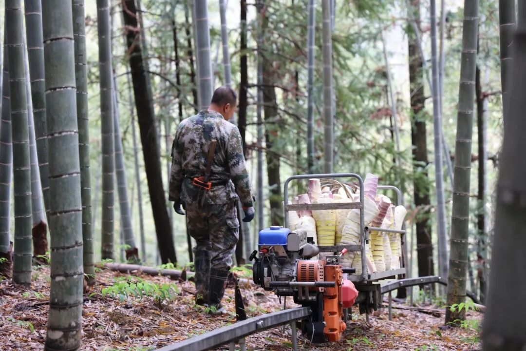 新桥乡毛竹资源丰富,竹林面积达7.27万亩,发展竹产业具备良好基础,但辖区内竹山多分布在高海拔区域,山路陡峭崎岖,笋、竹运输效率低。直到竹山轨道运输机的引入,有效解决了这一运输难题,既减轻了笋农的劳动负担,又降低了生产运输成本。