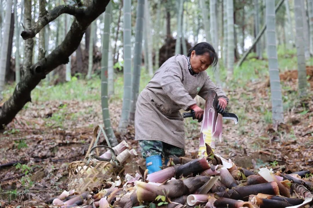 4月12日,走进新桥乡大兴村竹林示范片,青翠竹林间,一根根竹笋破土而出,长势喜人。趁着晴好天气,笋农们手持锄头、竹篓,穿梭在竹林间,熟练地采挖竹笋,一派繁忙的春日丰收景象。新桥乡大兴村笋农 杨英寿: “我们从3月中下旬开始挖笋,到现在差不多挖了四五千斤。挖的笋主要用于自己来做压榨笋,或卖给周边的客商。”