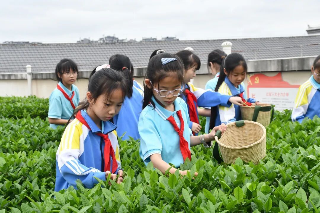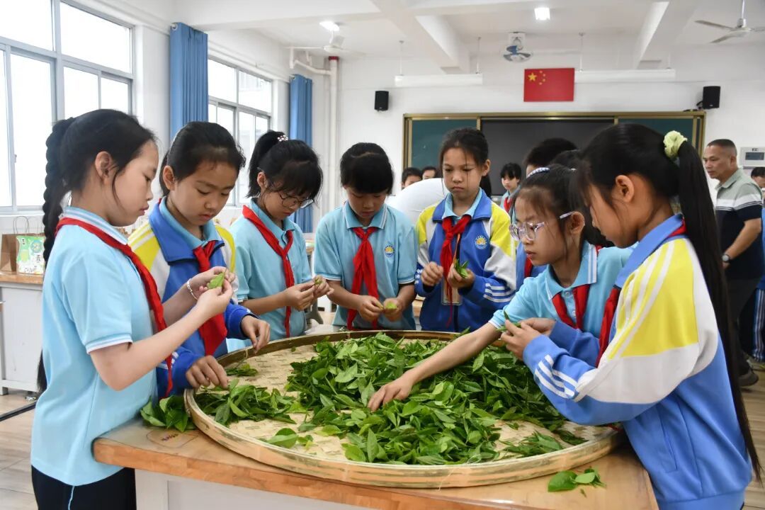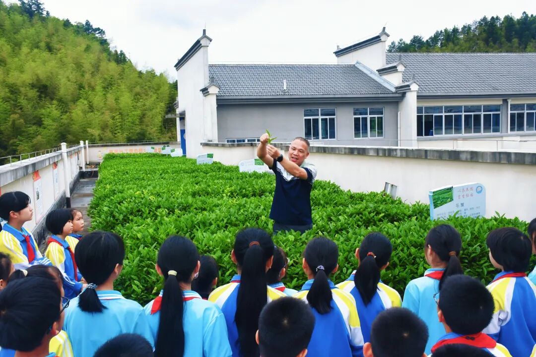 学生们小心翼翼地将鲜嫩的茶青放入小竹篓,亲身体验了从识茶、采茶到制茶、赠茶的全过程。这片占地1000平方米的校园实践基地,如今已成为学校“以茶养德、茗香校园”特色教育理念的生动实践场。 一堂沉浸式劳动课 “大家看,这才是标准的‘一芽一叶’,像小鸟的嘴一样微微张开。”姚水旺老师手捏一枚鲜嫩的茶芽,在同学们好奇的目光中仔细讲解。孩子们围在茶树旁,有的俯身细看,有的伸出小手轻轻触摸。 “叶子上真的有细细的绒毛!” “闻起来有青草的味道!” 观察与触摸,开启了他们与茶树的第一次对话。