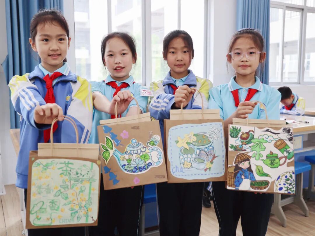 “哇,好香啊!” 惊叹声此起彼伏,随后是揉茶、烘干。在茶叶烘干期间,同学们拿出了事先准备好的茶叶包装袋,用画笔精心绘制。茶山风景、茶壶、茶杯等图案比比皆是,更多的是写下了真挚的寄语。 “这茶叶是春天的悄悄话——我们把课堂上的笑声都揉进去啦!” “这包茶叶会开花吗?就像老师教我们的知识,在心里发芽啦!”。 这份充满童真与感恩装饰,为茶叶注入了情感的温度。