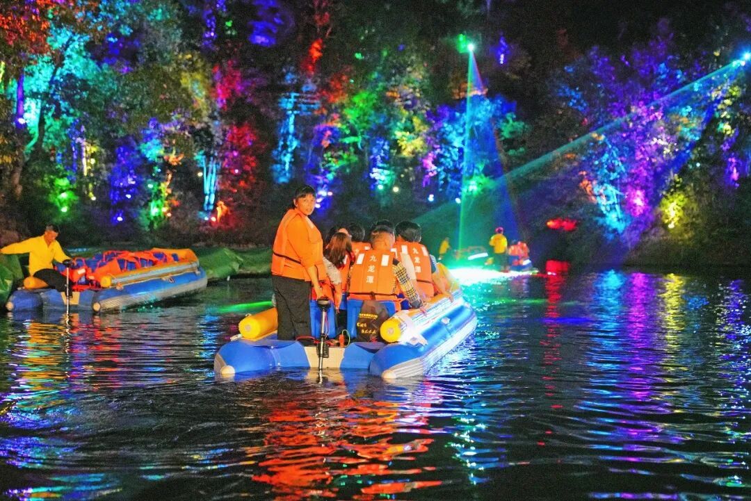 九龙潭夜游 将光影艺术与自然山水融为一体, 丹崖映光、水影如梦。