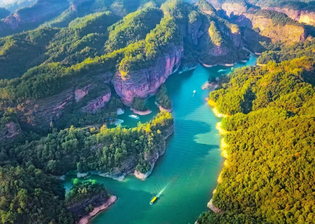 红配绿,赛神仙? 泰宁告诉你:是的! 大金湖的碧水与丹霞赤壁相映成趣, 被誉为“天下第一湖山”。 湖水近看是透明的绿, 远观则是一片深邃的绿,与天际线相接。
