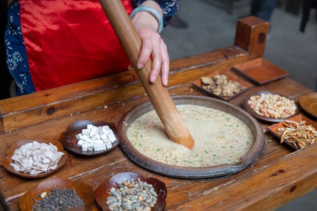 午后, 九举巷擂茶馆里飘出茶香, 非遗传承人手持擂棍研磨出的擂茶, 色泽青润、香气独特。