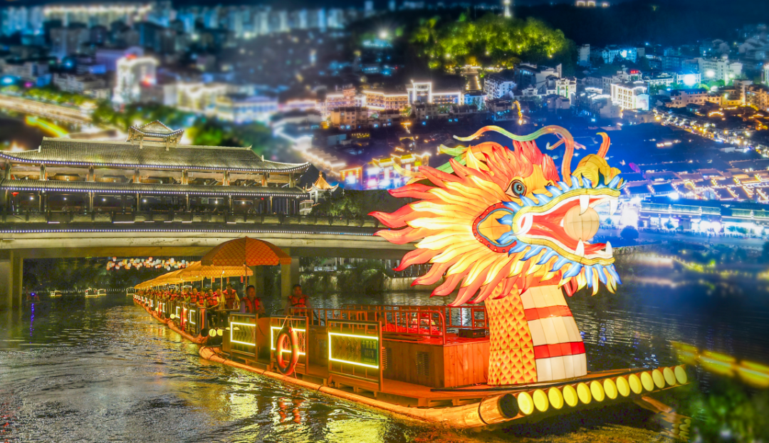 夜晚的泰宁,换上了一套全新的色系。 如果说, 白天的泰宁是水墨画, 那么夜晚的泰宁, 则是流光溢彩的赛博国潮。